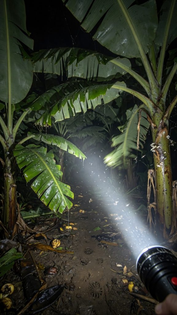 Perjalanan POV yang mencekam melintasi perkebunan pisang yang lebat di tengah malam, hanya diterangi oleh cahaya senter yang bergetar.