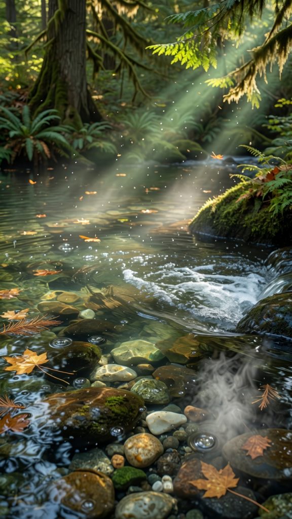 "audio": "Ambient soundscape consisting of layered, high-fidelity ASMR textures: the gentle, melodic gurgling of moving water, the crisp, rhythmic 'plip-plop' of droplets falling from ferns into the stream, the distant, muffled rustle of wind through cedar branches, and the subtle, low-frequency hum of a living, breathing forest ecosystem, completely absent of any human speech or artificial noise.",