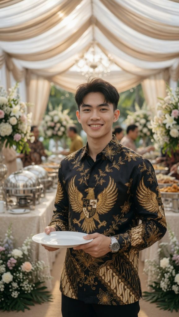 Seorang pria muda tampan dengan rambut hitam pendek alami yang rapi mengenakan kemeja batik tulis eksklusif berwarna hitam dan emas sedang berdiri dengan ramah di depan jajaran prasmanan mewah dalam sebuah pesta pernikahan yang elegan dan megah.