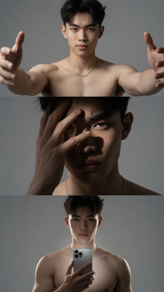 "subject": "The subject is a young man with striking, chiseled features and a lean, athletic build, characterized by an expressive face that conveys deep emotional weight. His skin is rendered with breathtaking realism, showcasing microscopic textures like individual pores, faint freckles across the bridge of his nose, and the subtle translucency of skin over bone on his hands. In the top panel, his bare shoulders display soft muscle definition and the natural sheen of skin under professional studio lights, his arms extending toward the lens with a sense of invitation and framing. The middle panel focuses on the intricate details of his hand—the delicate patterns of the palm, the slight tension in the tendons, and the way the skin folds as his fingers press against his forehead. His eyes are the focal point, featuring detailed irises with intricate flecks of color and a sharp, glass-like reflection of the studio soft-box. In the bottom panel, he holds a modern smartphone with a matte finish, his grip firm but relaxed, showing the interaction between human touch and cold technology, with the screen's glow providing a secondary, subtle light source on his chest and jawline.",