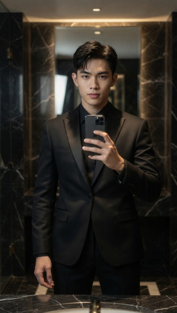 "prompt": "Ultra-realistic, 8k resolution, mirror selfie, stylish young man, bespoke slim-fit all-black suit, charcoal black silk lapels, crisp black dress shirt, Korean model aesthetic, flawless porcelain skin, soft inner glow, translucent skin texture, blemish-free complexion, neat layered hairstyle, wet look hair, individual hair strands, dark Nero Marquina marble bathroom, polished stone, gold accents, high-end smartphone, sleek glass back, sharp focus, depth of field, soft bokeh, cinematic lighting, dual-tone lighting, rim light, volumetric lighting, specular highlights, glossy reflections, luxury lifestyle, premium aesthetic, sophisticated mood, photorealistic, intricate fabric textures, wool weave, 85mm lens, f/1.8 aperture, ray tracing, masterpiece, hyper-detailed, global illumination, subsurface scattering, elegant poise, sharp jawline, deep soulful eyes, refined facial features, high-contrast, moody ambiance.",