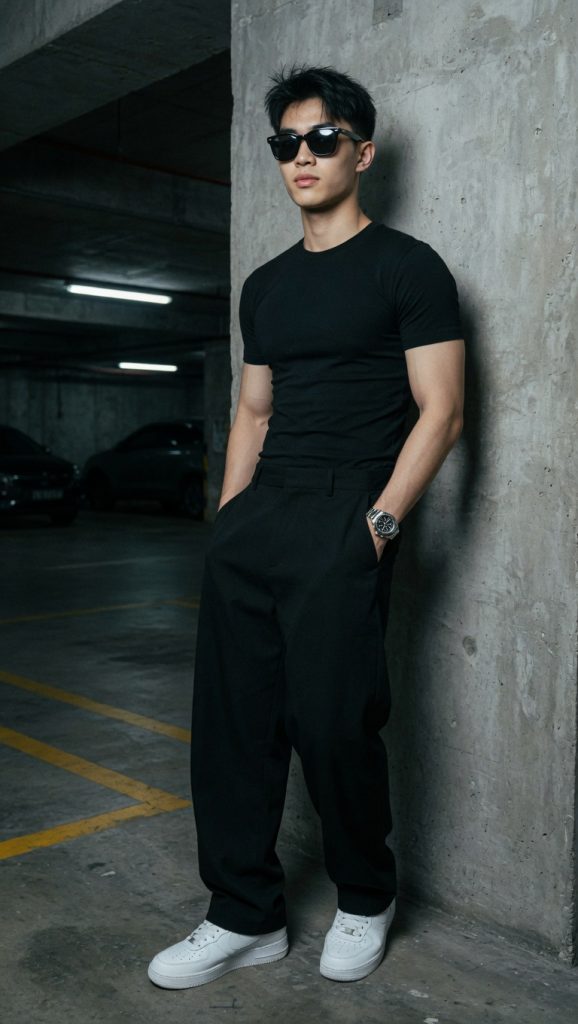 "prompt": "Man, male model, cool demeanor, bad boy aesthetic, street style fashion, all-black outfit, tight black crew-neck t-shirt, muscle fit, premium cotton texture, loose black tailored trousers, oversized fit, pristine white leather sneakers, clean white shoes, silver metal wristwatch, luxury chronograph, black wayfarer sunglasses, dark lenses, underground parking garage, basement setting, brutalist concrete wall, textured cement, yellow parking lines, blurred silhouettes of cars, low angle shot, 3/4 view, candid photography, natural pose, hands in pockets, leaning against wall, direct flash photography, harsh shadows, high contrast, fluorescent neon lighting, cold color temperature, cinematic urban atmosphere, 8k resolution, photorealistic, iPhone 15 Pro camera aesthetic, sharp details, fine skin texture, film grain, hyper-detailed, masculine energy, editorial fashion photography.",